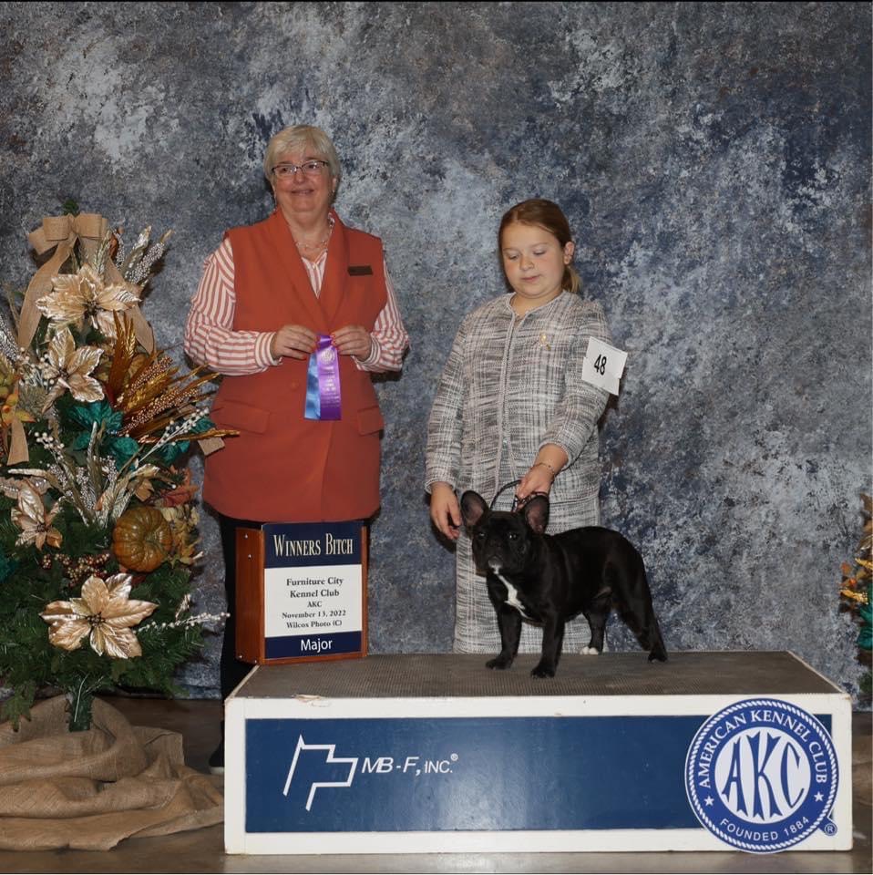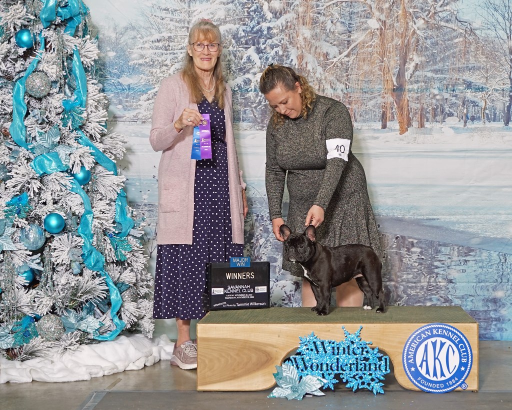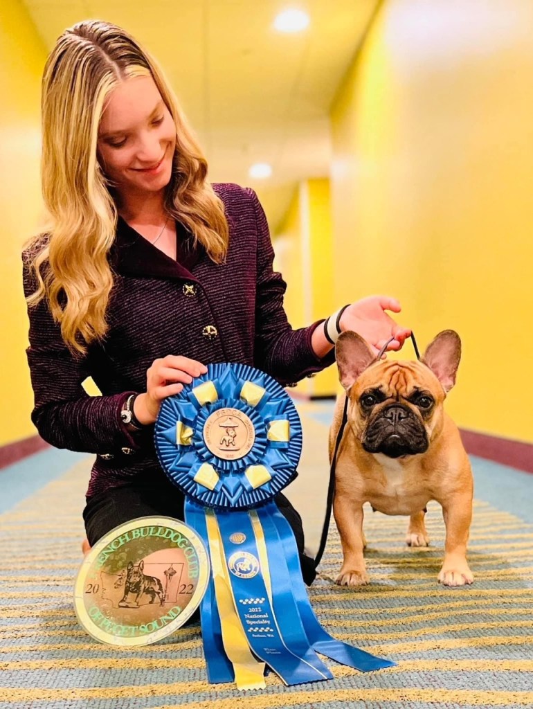 I had always been interested in French Bulldogs, but had owned Greater Swiss Mountain Dogs and Pembroke Welsh Corgis with my husband. While he showed the dogs, I stayed behind the scenes, grooming and caring for the dogs. Eventually, my desire for the French Bulldog grew, and my husband said: